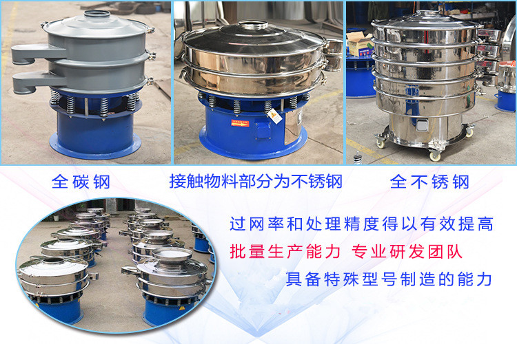 旋振篩是一種高精度細粉篩分機械,工作原理是由直立式電機作激振源,電機上、下兩端安裝有偏心重錘,將電機的旋轉運動轉變?yōu)樗?、垂直、傾斜的三次元運動,再把這個運動傳遞給篩面。調節(jié)上、下兩端的相位角,可以改變物料在篩面上的運動軌跡,由于其振動運轉原理很多企業(yè)也稱之三次元振動篩分過濾機,根據外形結構被部分客戶稱呼為圓形篩,從材質上分標準型旋振篩和普通型旋振篩的,標準型的與物料接觸部分為304不銹鋼材質,底座為碳鋼材質,普通型的通體為普碳鋼材質。