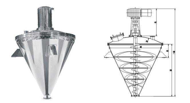 立式螺帶混合機(jī)由傳動部分、螺桿攪拌器、倒錐形桶體組成。